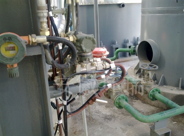 壓力變送器液位計常應氣候溫度過低,造成堵塞現象,需要電伴熱防凍,渝豐化工要求其冬季維持溫度為5--10℃,并且要求電伴熱帶具有防爆防腐功能。安徽環瑞提供ZRDHR-PF46滿足客戶對使用場合及維持溫度要求,其最高表面溫度為70℃,耐溫可達200℃。可保證維持溫度的情況下,不會出現溫度過高的情況,更加經濟安全,而針對現場細長狹窄的地方自限溫電熱帶可實現交叉纏繞,解決局部伴熱的問題。以下為現場施工安裝圖: