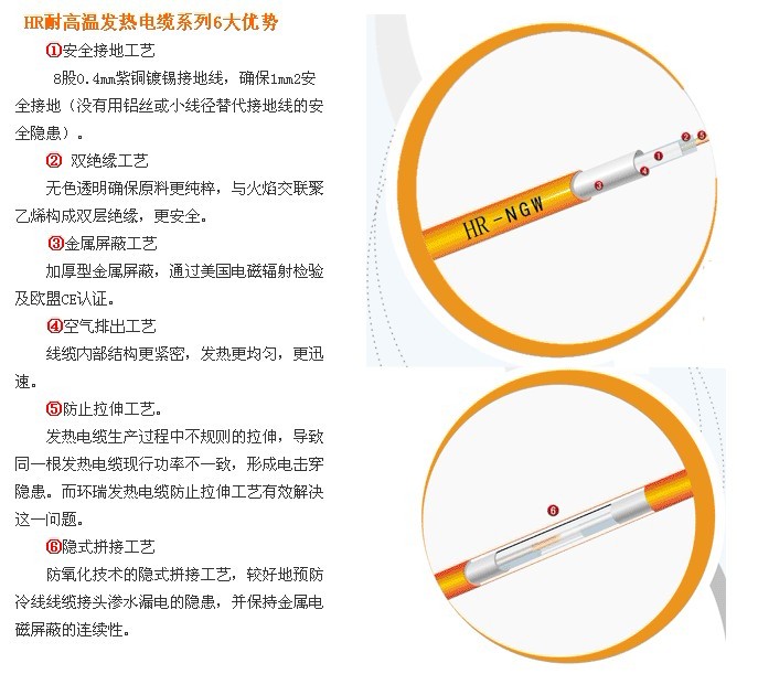 安徽環(huán)瑞采用新的雙絕緣工藝耐高溫的發(fā)熱電纜,包括有發(fā)熱合金,所述的發(fā)熱合金外依此包覆無色透明氟隆絕緣層、火焰及蒸汽交聯(lián)聚乙烯絕緣層、8*0.4mm鍍錫紫銅絲接地、加厚型金屬電磁屏蔽,阻燃型PVC外護(hù)套使用方便安全,壽命長(zhǎng),適用于高溫環(huán)境下的輻射供暖。