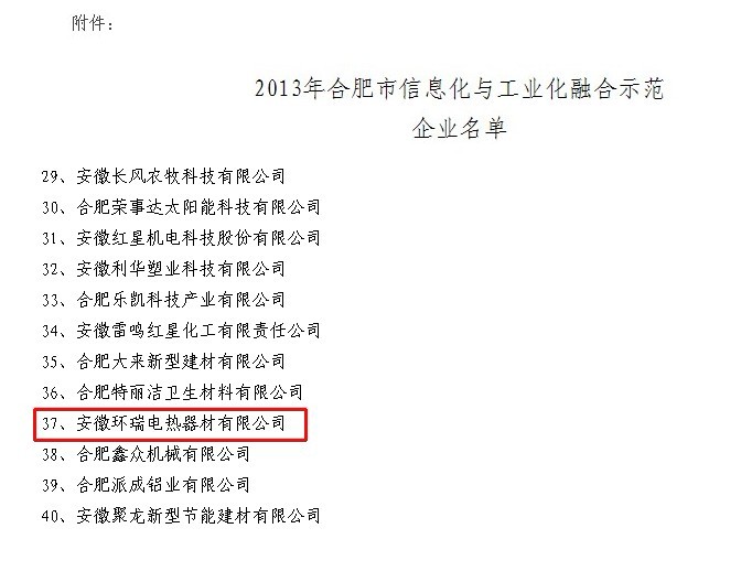 為加快推進我市兩化深度融合,發(fā)揮典型示范作用,依據(jù)《合肥市信息化與工業(yè)化融合示范企業(yè)認定管理辦法(試行)》和《合肥市第三方企業(yè)信息化公共服務(wù)平臺認定辦法(試行)》等文件,經(jīng)企業(yè)申報、縣區(qū)推薦、專家評審和綜合審查,現(xiàn)確定安徽環(huán)瑞電熱器材有限公司,等40家為2013年合肥市 安徽環(huán)瑞將積極響應(yīng)政府的有關(guān)倡導(dǎo):不斷提升自身信息化應(yīng)用水平,切實發(fā)揮示范企業(yè)帶動作用,認真總結(jié)信息化建設(shè)經(jīng)驗,積極探索利用信息技術(shù)推動產(chǎn)業(yè)升級轉(zhuǎn)型,發(fā)展新型業(yè)務(wù)模式,培育新業(yè)態(tài),走出一條合肥特色的信息化與工業(yè)化深度融合的“科技環(huán)瑞”的發(fā)展道路,促進電伴熱帶,發(fā)熱電纜產(chǎn)業(yè)結(jié)構(gòu)優(yōu)化升級,最終為振奮合肥的經(jīng)濟,做出貢獻!