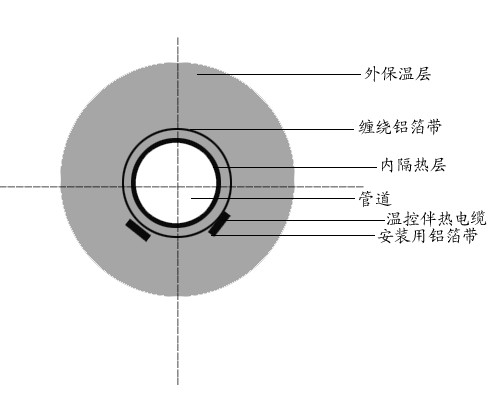 由于蒸汽掃線時間相對較短。一般控制在30分鐘左右??刹捎孟聢D雙層保溫結構來保證使用。一般來說,這種結構的內層保溫厚度為5-10mm.在內保溫層外加包鋁膠帶,鋁膠帶上敷設自控溫電熱帶。每毫米內層保溫層可使掃線溫度減低10℃左右,或采用隔離支架,每米1—2只,效果也較理想。當然,在掃線時必須停止通電,管線熱損失仍按常規(guī)設計,保溫層厚度只能按外層為計算厚度。