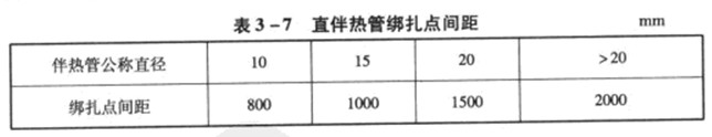 伴熱管應與主管平行安裝,并應自行排液。當一根主管需要多根伴熱管伴熱時,伴熱管之間的距離應固定。水平伴熱竹宜安裝在主管下方或靠近支架的側面,鉛垂伴熱管應均勻分布在主管周圍,不得將伴熱管直接點焊在主管上,而可采用綁扎帶或鍍鋅鐵絲等固定在主竹上。彎頭部位的伴熱管綁扎帶不得少于3道.直伴熱竹綁扎點間距應符合表3一7的規定。