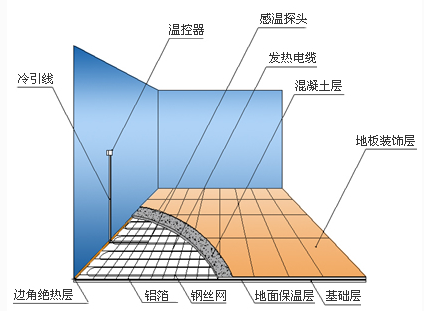 通過鋪設于地板上的地溫探頭或溫控器內的室溫探頭,由房間溫控器控制溫度。當室內溫度達到設定值后,溫控 器開始動作,斷開發熱電纜的電源,發熱電纜停止加熱,當室內溫度低于溫控器設定值時,溫控器又開始啟動, 接通發熱電纜的電源,發熱電纜開始加熱,這樣往復運行。
