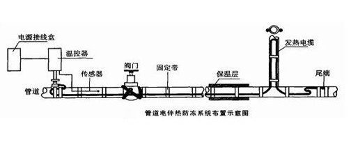 當敷設單根電熱帶時,敷設時應盡可能使電熱帶平整地緊貼在管道表面,用聚酯帶或鋁箔膠帶固定,嚴禁用細絲捆扎,如遇法蘭、閥門等尖銳突起部分,應注意保護。在水平管道上安裝時,可敷設在管道下45度側方,用玻璃纖維壓敏膠帶或鋁膠帶每隔約30Cm處將電熱帶固定于管道上。如上圖電熱帶應按管道長度分布,以免物料在無電熱帶處降溫凝結,電熱帶的長度應長于被伴熱管道。在線路的第一供電點和尾端各預留1m長的電熱帶電熱帶在穿過墊木等支架時,應在支架上打眼穿孔,必須保證伴熱帶緊貼在管道上,再使用密封膠封堵。每個回路的電熱帶安裝完畢,再確認整個回路長度滿足設計要求后,才可剪短電熱帶